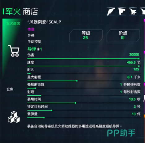 风暴阴影:初始的伤害数值是2万,速度可以达到466.5节。如果是在满级的状态下就可以造成26,000的伤害,装填的时间是7.3秒。