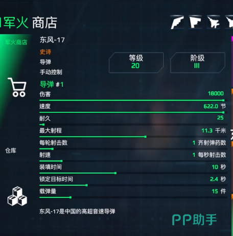 东风 17:这一个导弹的实力还是很出色的,整体就可以造成的伤害数值为18,000,速度可以达到622,如果是在满级的状态下,那所造成的伤害数值就可以达到23,400。装填的时间是七秒,整体的实力还是比较出色的。