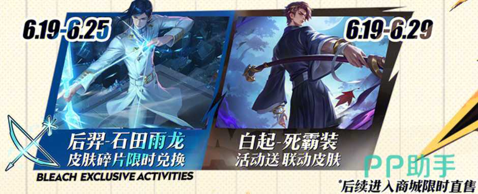 白起·死霸装(勇者限定),还原千年血战篇中的“死霸装”一护的造型,可通过联动活动免费领取,后续于6月30日~7月22日会在商城限时上架(488点券)。后羿·石田雨龙(史诗限定),石田雨龙风格后羿,刚好两位都是用弓箭的,首周88皮肤碎片兑换免费,6月26日起商城直售(首周710点券,后续888点券)。