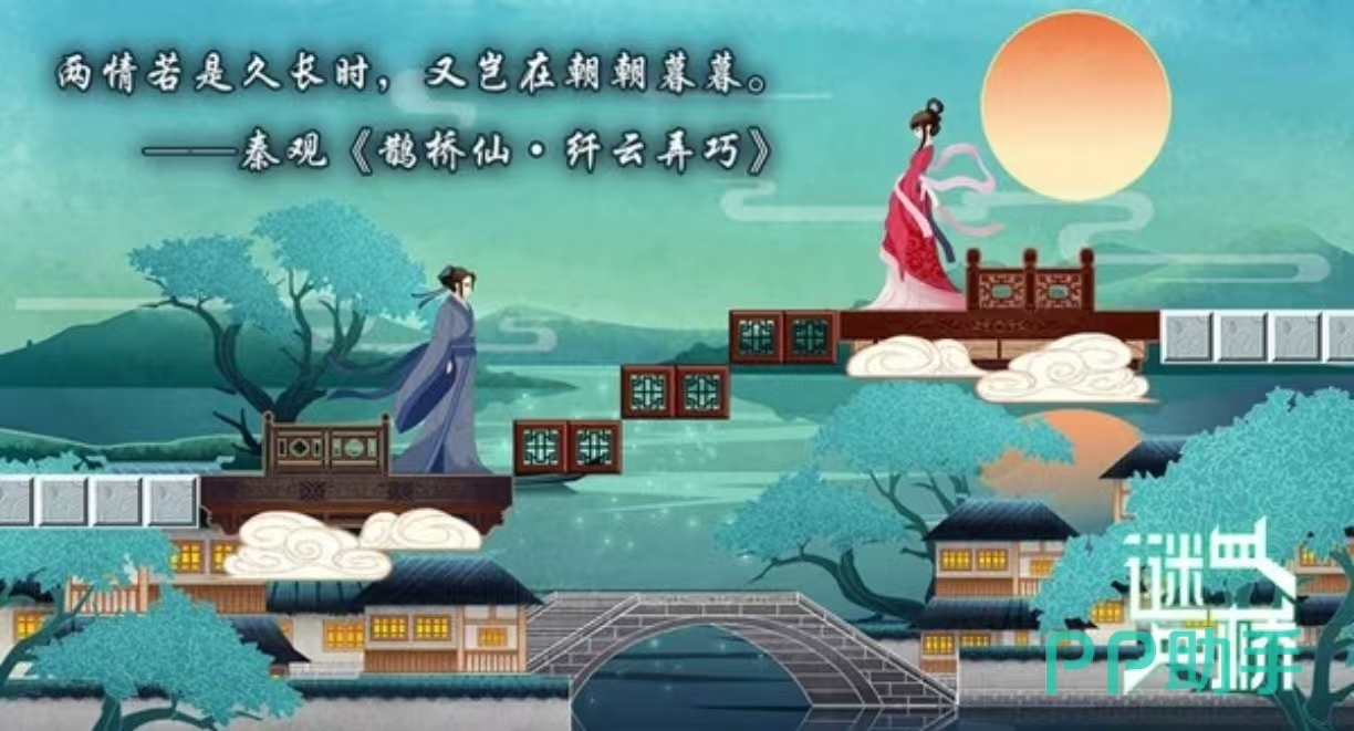 《谜桥》游戏内加入了很多古风的元素,还有一个古风的背景音乐伴随,讲述的是牛郎和织女的爱情故事。每个关卡内都需要完成很多的挑战,来到许多不同的古风场景中,也提供了很多的台词。需要完成许多的俄罗斯方块挑战,难度也会直线的进行升级。挑战成功后会帮助角色进行相会,提供了众多的剧情关卡,每一个章节内都有大量的关卡。