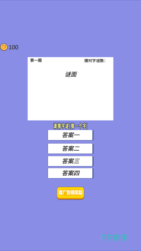 这里会给出一个谜面,玩家根据谜面来猜字,谜面简单易懂,下面有四个谜底,玩家需要根据这四个提示来猜字,这里就是需要开始动脑的地点了,到底哪个字是符合谜面的呢?如果觉得确实难以猜出,下方有看广告,广告时间后,还会给出更多的提示来猜,如果确实难以答出,答案会在哪里,仔细寻找定然可以找出答案。