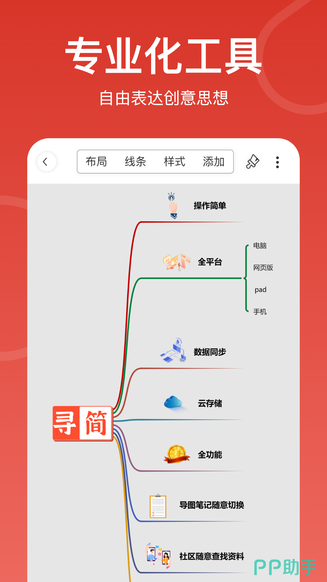 简单的界面,让操作窗口最大化,复杂的导图,通过简单的操作步骤即可转化为简单的导图,寻简思维导图同样含有云同步服务,团队成员即使分布天南海北也能进行远程协同创作,每个成员都可以将自己的想法书写在一个导图之上。