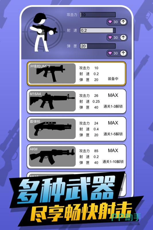 操作一个火柴人完成挑战任务,在开始任务之前需要玩家先挑选武器和装备,然后领取任务,进入游戏后需要需要狙击的人物,这里需要有快速的反应能力和足够的判断力,需要快速锁定的狙击目标,这里有很多的狙击手同时向玩家射击,玩家要一瞬间完成目标的狙击,不然也会有很多的枪手同时攻击玩家,可以先选择几个狙击手射击,但是在游戏结束前要完成狙击目标人物。
