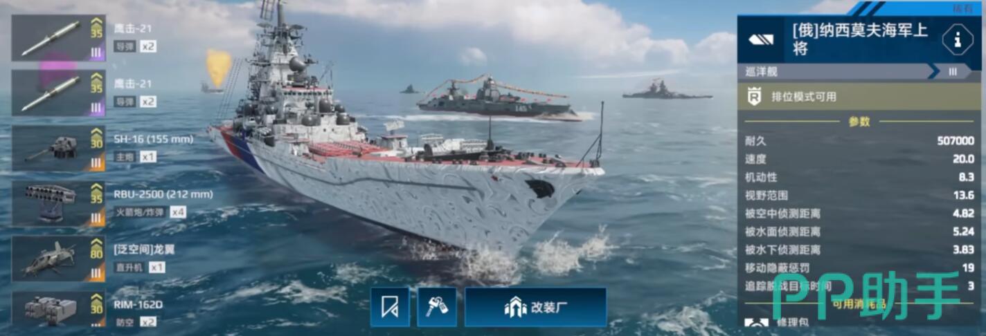 纳西莫夫海军上将号战列舰名号称移动堡垒。 其60万超高血量让它能硬扛多数集火,但需注意完全无反潜能力的短板,遇到潜艇必须依赖队友掩护。主武器优先搭配布拉瓦导弹(射程18公里)+电磁轨道炮,利用布拉瓦远程消耗敌舰血量,待对方热诱弹耗尽后切电磁炮贴脸爆发,单轮可打出47万伤害。防空槽务必装满12组S-400导弹,手动锁定敌方轰炸机群或东风导弹,能拦截90%空中威胁。