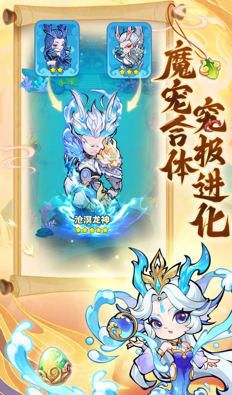 角色养成轻量化但内容丰富。游戏包含凡品卓品绝品仙品四档魔宠,孙悟空灵汐龙女等经典角色均以Q版形象登场。魔宠通过召唤获取,升星合体强化提升战力,离线挂机可自动积累资源,大幅降低养成负担。新手福利丰厚,通关即送绝品魔宠,零氪也能组建强力阵容。
