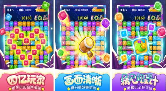 以经典的消灭星星为主题,有简单易懂的规则,即便是新手也能轻松参与其中,通过点击两个或者两个以上相邻颜色相同的星星就能够消除。有多种特色玩法,比如经典模式并没有任何时间限制,适合新手玩家,还有星星联盟,融入俄罗斯方块元素,通过拖拽的方式完成消除。