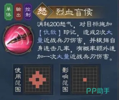 烈血盲侯作为夏侯惇的怒气技能,此技能需要消耗200怒气,当怒气值积攒足够时,夏侯惇会对目标施加仇敌印记,紧接着夏侯惇会对目标造成2次大量近战兵刃伤害,这两次攻击会根据自身连击几率,还有一定概率额外追加一次大量近战兵刃伤害,这一技能的爆发力很高,在团战或者对战强大敌人时是很好用的。