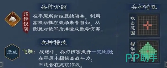 当受到伤害时,他对攻击者施加的仇敌印记,会让敌人在后续的行动中时刻感受到威胁,而自身与敌方移动力相差1格所带来的兵刃伤害少量提升,更是让他能够利用位置关系,最大化自己的输出能力,这里仇敌的效果是一旦被夏侯惇视为仇敌,敌人在释放技能时,将会额外遭受一次80%近战兵刀伤害,夏侯惇的兵种为摧锋锐骑,他们拥有着极高的机动性,能够在广阔的战场上战斗。