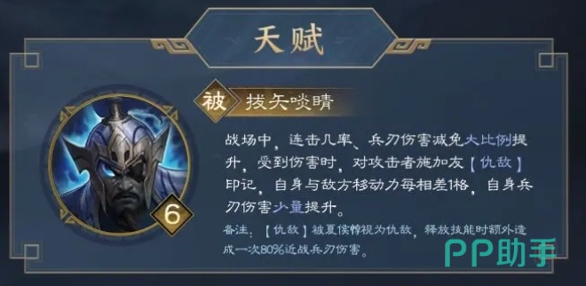 当夏侯惇受到敌方攻击时,他的反击会瞬间对攻击者施加一种仇敌印记,此时自身与敌方移动力每相差1格,夏侯惇自身的兵刃伤害便会得到少量提升,这使他在战场上能够根据与敌人的站位灵活调整战术,而且在战场上,夏侯惇连击几率的提升,让他在攻击时能够更频繁地发动连续攻击,同时兵刃伤害减免的大比例提升,则使他在面对敌人的猛烈攻击时,还是可以在场输出。