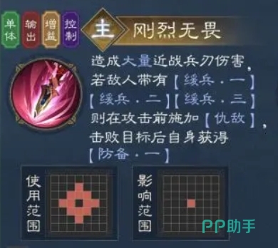 当刚烈无畏技能发动时,夏侯惇会对敌人造成大量近战兵刃伤害,如果在攻击前,敌人带有缓兵一、缓兵二、缓兵三等负面状态,夏侯惇则会在攻击前继续施加仇敌印记,让敌人在受到攻击的同时,还要承受仇敌印记带来的额外伤害,而且在成功击败目标后,夏侯惇自身还会获得防备一的强大效果,其中缓兵一会使敌人的移动力-1,缓兵二使移动力 -2,缓兵三使移动力 -3,而防备一则能让夏侯惇的兵刃减免达到20%,这一系列的效果组合在一起让夏侯惇的洗行动更加全面。