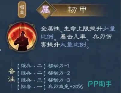 最后夏侯惇的属性增益效果韧甲,为他的整体实力锦上添花,这一效果能够全面提升他的生命上限,虽然只是少量比例的提升,但却让他在战场上的生存能力得到了进一步的保障,同时暴击几率和兵刃伤害提升大量比例,这使得他在攻击时能够打出更高的伤害。