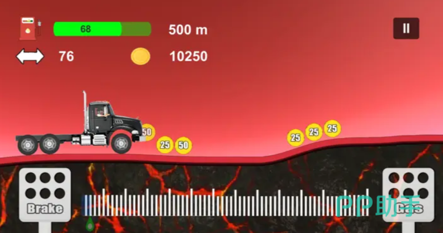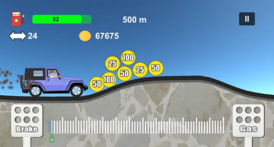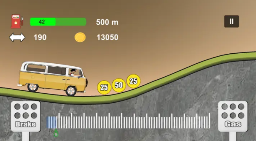 操作方式直观易上手,从左侧起点出发,目标是尽可能顺利地到达右侧终点,同时尽量多收集沿途的金币与加油卡。金币可用于解锁新的车辆与地图,加油卡则能延长续航时间,避免因燃油耗尽而中途止步。