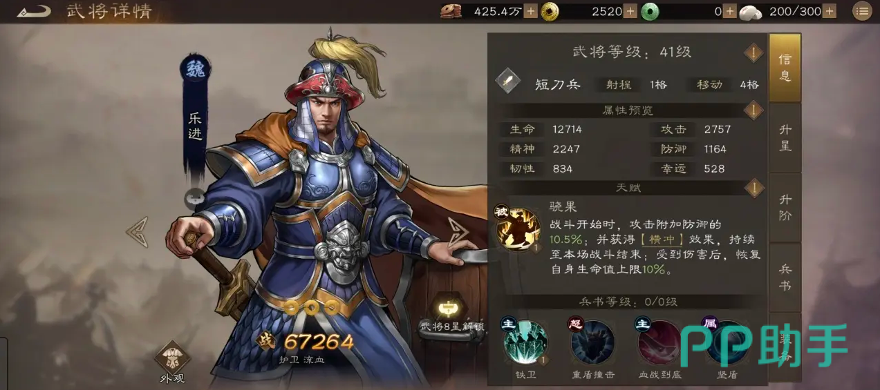 乐进的“骁果”提供基于攻击的防御成长,同时附带免疫移动力削弱与受击回血,是标准的抗线型天赋。“铁卫”可为周围队友承担伤害,并施加兵刃减免,适合承担前排压力;“重盾撞击”集清除负面、增益防御与反击于一体,是稳定阵地时的关键输出;“血战到底”除群体打击外还能附加流血效果,在拖延战局中不断削弱敌军血线。