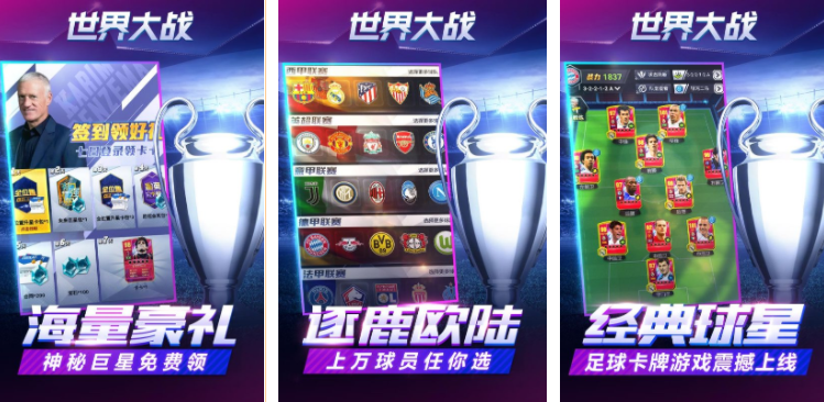 足球是一项非常受欢迎的运动,在世界大战这个游戏里,玩家体验到不是各个国家之间的战争,而是足球场上的对战,里面会有很多非常经典的足球成员,以及超多的教练,玩家可以扮演成教练,组建自己的球队,不断参与征战,里面有上万球员,可以让玩家自由选择,为了能让操作更加便捷,使用的是卡牌足球对抗,喜欢这种体育运动的玩家,都可以进入游戏,选择喜欢的成员进行球场战斗。