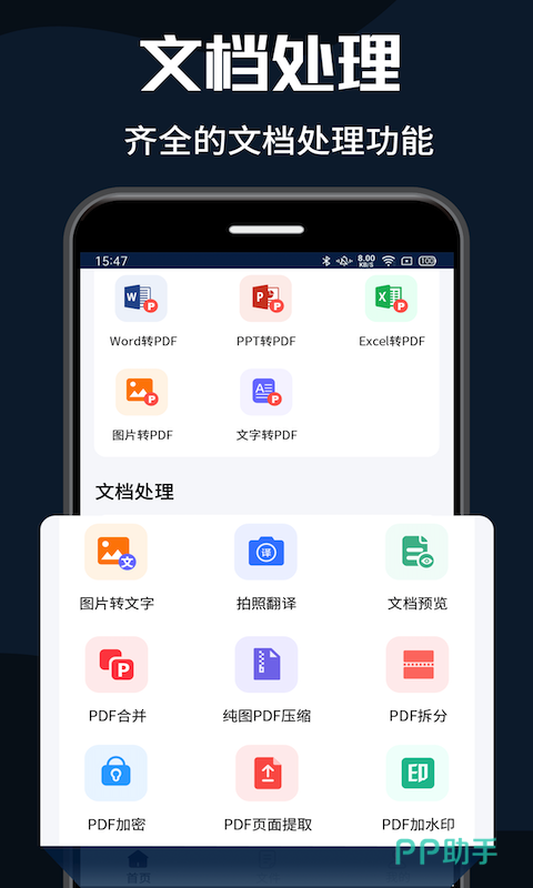 这款软件擅长将PDF与多种其他格式进行相互的转换,也具备高效的PDF文件合并能力,能保证文件的完整性和清晰度。另外还有拍照翻译、文档预览、图片转文字等实用的功能。