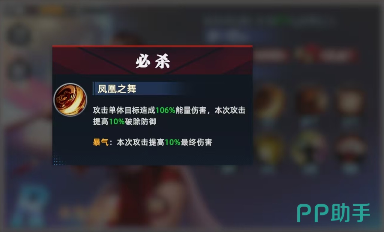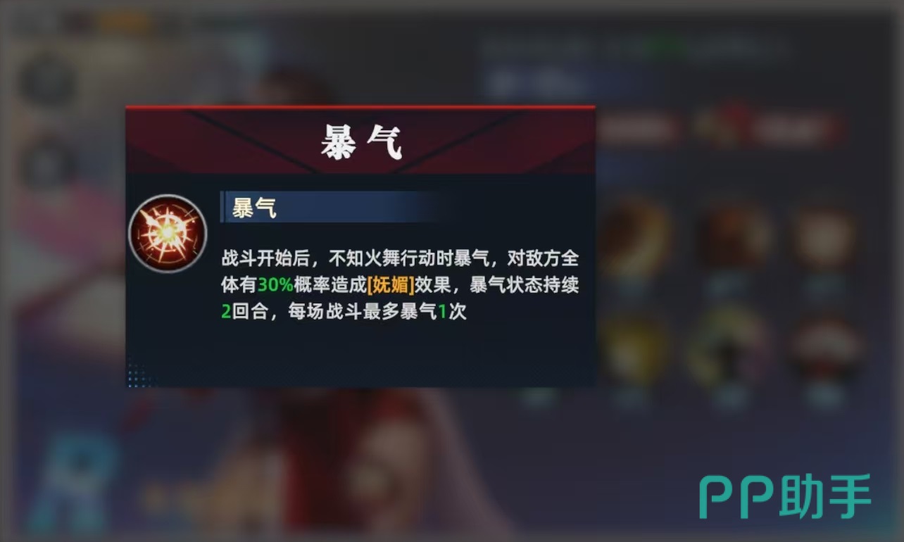 不知火舞是属于攻击性的英雄,在战斗开始时,不知火舞行动时就能直接爆气,对敌方全体有30%的几率造成妩媚效果,爆气状态持续两个回合。必杀技凤凰之舞,对敌方单体目标造成能量伤害,本次攻击时可提高10%破除防御的效果,如果是在爆气状态下,本次攻击额外提升10%的最终伤害。