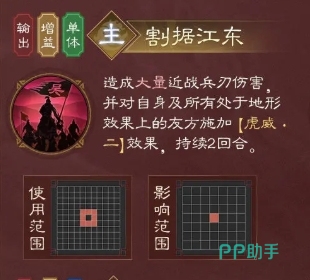 孙权的一个主动技能叫做割据江中,割据江东这一技能是孙权在近战中的利器,当他发动这一技能时,带来的是兵刃类型的伤害,还可以把虎威这个增益效果施加给队伍里其他的成员,这种效果会持续两回合,在虎威的影响下,被影响的目标伤害减免能力会得到提升,格挡几率也会大幅上升。