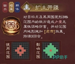 另外一个主动技能则是扩土开疆,这是一个具有强大范围伤害和辅助效果的技能,使用的时候达到的范围是菱形三格范围内的,且其中的目标受到伤害之后是无属性谋略伤害,并且还会对范围内地形施加虎啸效果,这一效果与天赋所附加的虎啸如出一辙,能够进一步提升友军的实力,除了主动技能,孙权的怒气技能权御天下更是威力惊人。