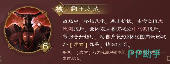 然而孙权的兵种却仿佛拥有一种神奇的免疫能力,不会被任何兵种所克制,孙权的天赋名为帝王之威,当孙权置身于战场之中时,这一天赋便带来的格挡几率会大幅提升,暴击抗性也得到了增强,同时他的生命上限也会大幅度提高,不仅如此,全体友方的爆伤减免比例也会随之提升,且在每个回合开始时,孙权还能够对自身菱形两格范围内的地形施加一种虎啸效果,这种效果会持续一整个回合。