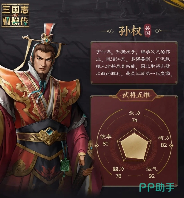 新三国志曹操传孙权技能有哪些现在大家了解清楚了吗?他完全可以成为一个主力核心,虽然他自身并不属于那种纯粹的输出核心型武将,但他所附加的一系列效果,对于整个队伍的提升作用却是极其明显的。