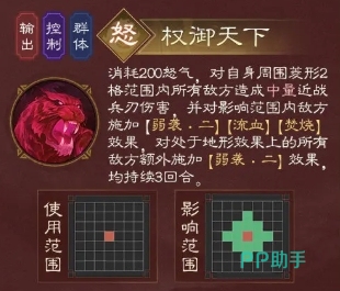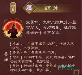 怒气技能是当怒气值积攒到200时,孙权便可释放,此时的技能生效范围是菱形2格之内,同样是兵刃类伤害,然后给敌军施加多种负面效果,其中包括弱袭二、流血、焚烧效果,而且对于处于地形效果上的所有敌方,还会额外施加弱袭二效果,这些效果均会持续3回合,从属性角度来看,孙权作为统帅,能够为自身带来全属性、生命上限的少量百分比提升,同时还具备兵刃减免的能力,此外他的被疗效果还能提升中量百分比,这使得他在受伤后能够更快地恢复状态。
