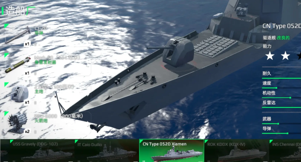 导弹可以直接选择海星导弹,该导弹拥有1.5万高伤害贴脸输出效果,可以直接秒杀敌方驱逐舰,如果玩家并未拥有海星导弹,也可以使用拉布莫斯导弹进行替换,拉布莫斯导弹拥有极强的射程,并且可以进行双发连射,但爆发能力略逊一筹。