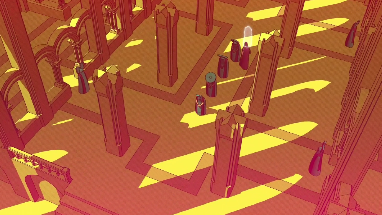 第三个雕像代表的是“信徒”雕像,玩家需要让其正面,朝向上方的雕像即可,即视线仰视。