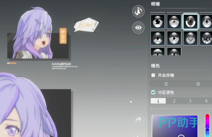 然后就是五官的改变,五官方面的眼睛可以直接从选项里找出,这种眼睛是属于比较大且方圆类型的,可以直接选择中间的那个眼睛,然后就是眼睛的颜色,也可以直接选择紫色,这样跟发型是比较搭配的,眉毛的话直接选择最后一个选项,这样五官的塑造就大致完成了。