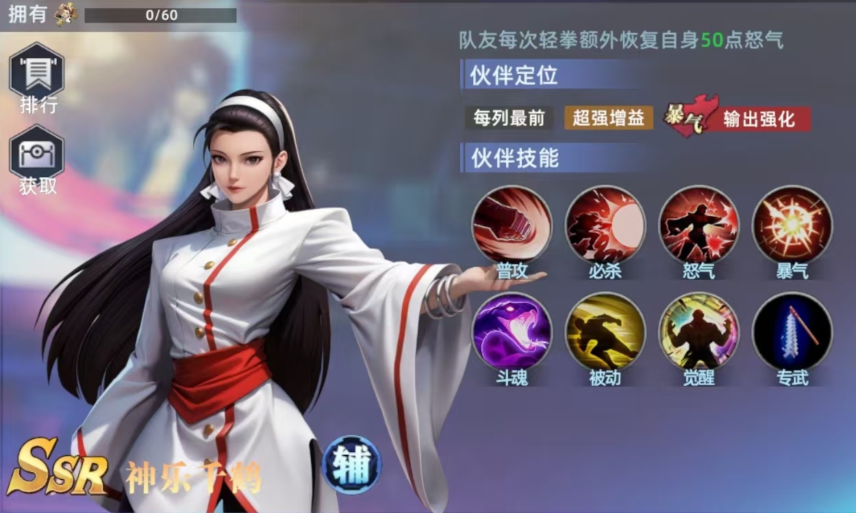 作为一名女性格斗家,神乐千鹤的辅助能力非常强,她具有超强的增益效果,爆气还可以带来输出强化。队友的每次轻拳都可以为神乐千鹤额外恢复50点怒气。在首回合开始时,神乐千鹤直接爆气获得一次重拳,并使我方攻击力最高的伙伴,首次怒气技能提高30%的伤害。这样再搭配上一些能够额外获得怒气的格斗家,在首回合就可以打出非常狂暴的输出。