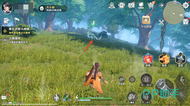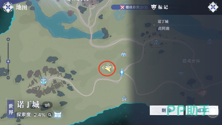 第一只是在诺丁城地图左下角,如图所示“密林西部”传送点的左侧,给大家画了一个标记,追踪这个标记的方向就能找到这只鹿了,体型很大的绿色鹿,在树林里还是能轻松发现的,击杀掉卤阿鹿之后会掉落3张武魂觉醒券。