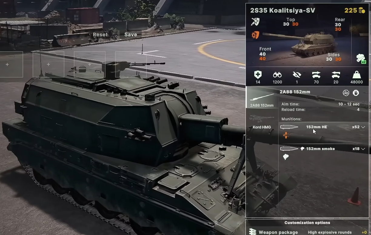 2S35配备152毫米榴弹炮,自动装填时间4秒,射程4.2-4.5公里,可发射激光制导炮弹。其武器选配包括极速弹药和增程炮弹,具备高精度打击能力。