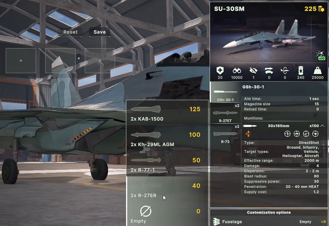 SU-30SM为四代半多用途战机,最大起飞重量34吨,载弹量8吨,续航3000公里。其武器系统包括30毫米机炮、R-27ET/R-73空空导弹,机身可选挂R-27B、R-77-1中远程导弹或1500公斤精确制导炸弹。机翼内侧挂架支持三种口径火箭弹或Kh-29M反坦克导弹,外侧可挂电子对抗吊舱或R-73导弹。该机具备两枚或四枚R-60短程导弹配置,或加装电子对抗吊舱提升10%干扰能力。