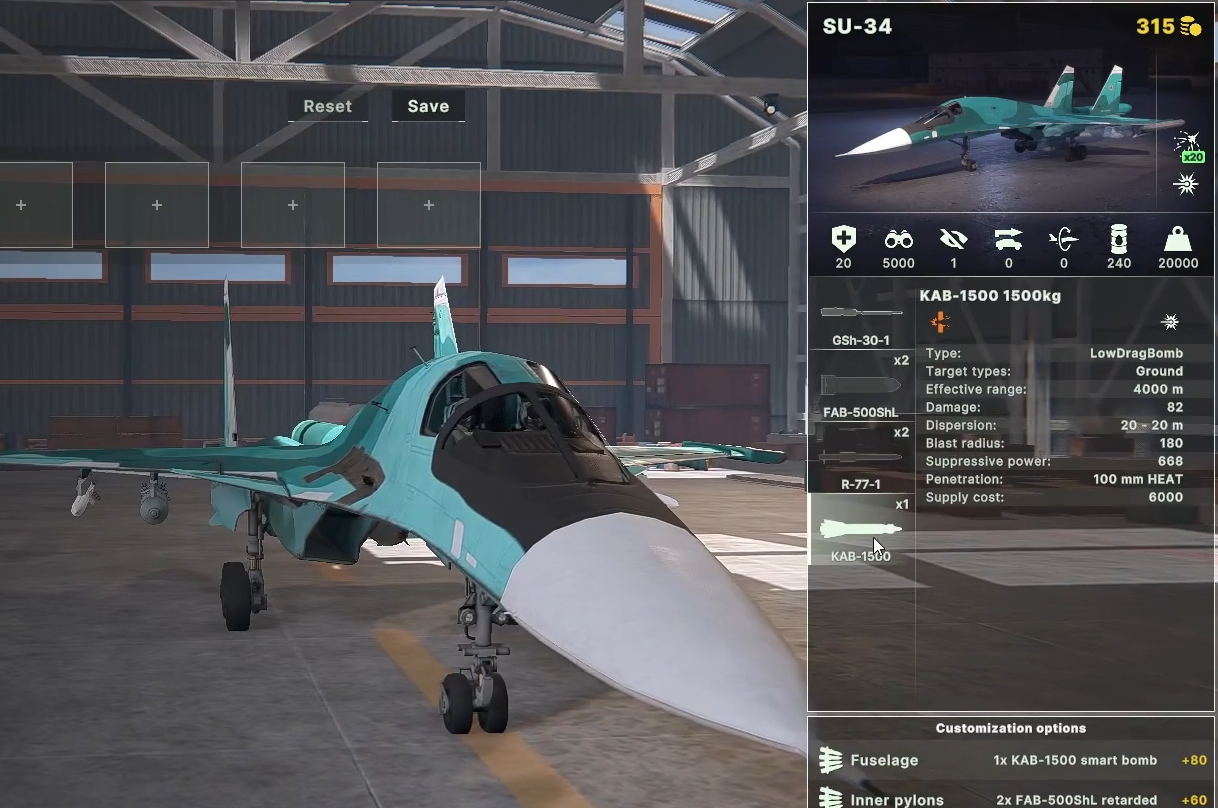 SU-34配备30毫米机炮,机身挂载500公斤航弹、中程空空导弹及1500公斤精确制导炸弹。其武器配置灵活,可换装Kh-38ML精确制导导弹、ODAB-500温压弹或ZB-500燃烧弹。机翼内侧挂架支持Kh-31P反辐射导弹,外侧挂架以电子对抗吊舱和空空导弹为主。该机视野5000米,内置激光导引系统,可携带12枚250公斤航弹或6枚500公斤高阻力航弹。