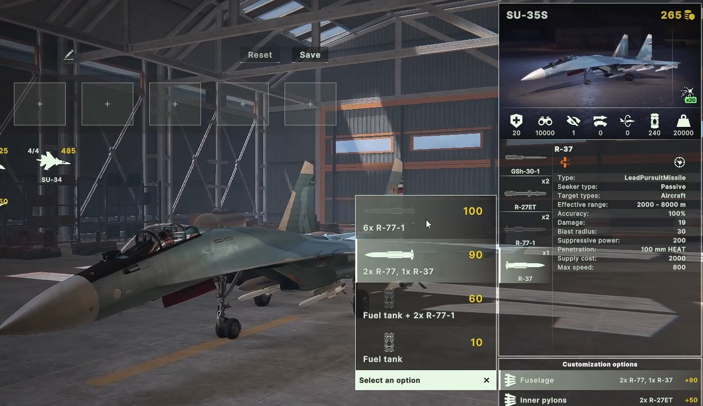 SU-35S默认搭载30毫米机炮及两枚中程空空导弹,机身可选挂副油箱、R-77或R-37远程导弹。其内侧挂架覆盖短、中、远程空空导弹组合,外侧支持电子对抗吊舱。该机最大载弹量8吨,武器配置包括R-77-1中程导弹、Kh-59MK巡航导弹及多种精确制导炸弹,具备制空作战能力。
