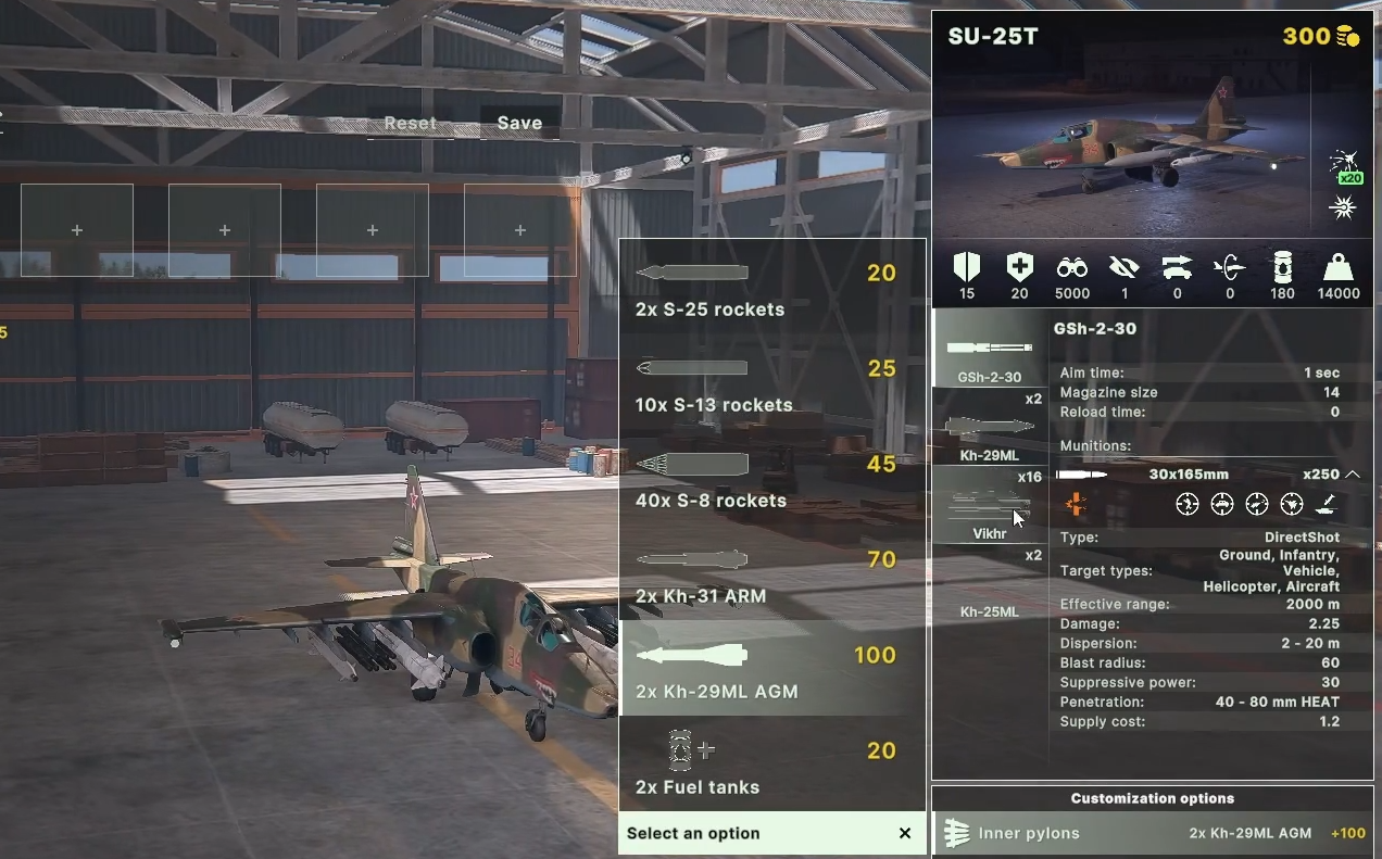 SU-25T是专用反坦克改型,机腹配备30毫米双管机炮,每侧翼下挂载8枚“旋风”反坦克导弹,可击穿1000毫米装甲,射程10公里。其导航/攻击系统集成激光测距、目标标识及平显设备,支持夜间作战。武器配置灵活,可换装KAB-500激光制导炸弹、AA-8空空导弹,或携带火箭巢发射57毫米/80毫米火箭弹。机翼尖端装有电子对抗吊舱,增强生存能力。
