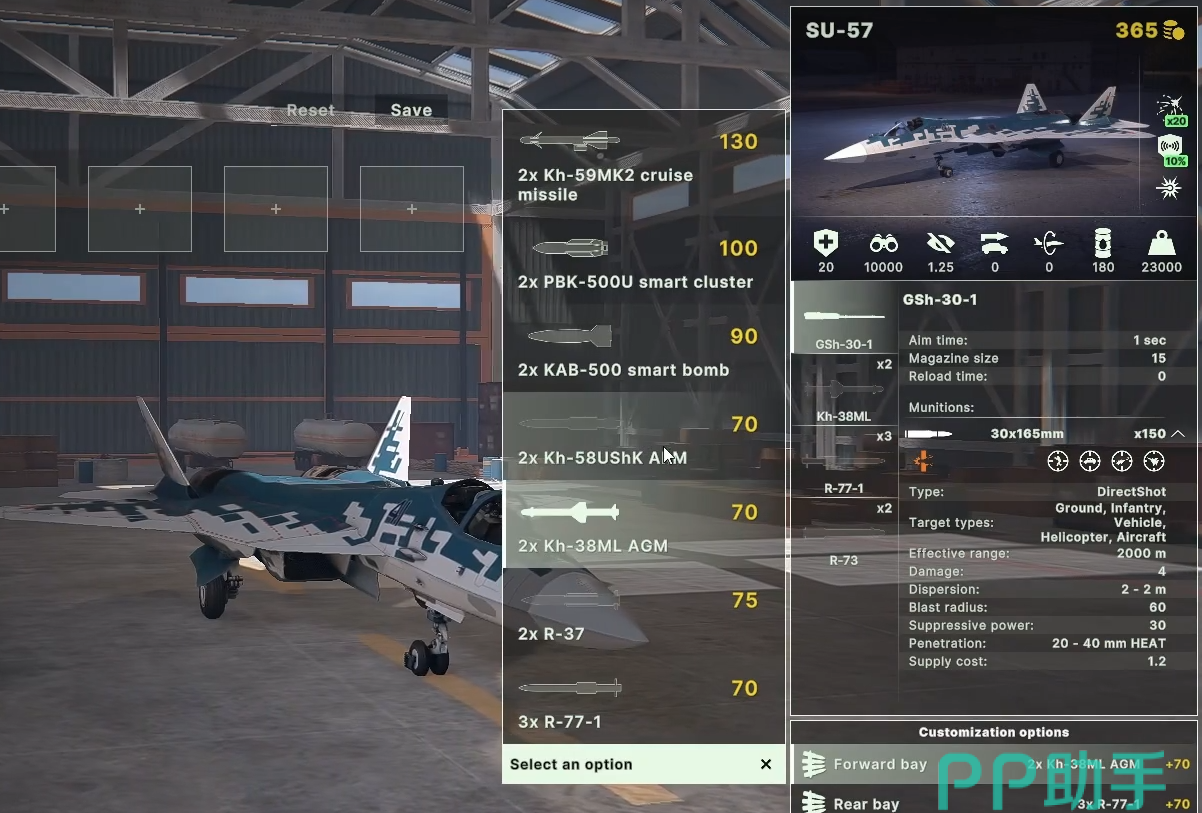 SU-57内置4个武器舱,默认携带6枚中程和2枚短程空空导弹。前舱可装备3枚中程导弹、2枚远程导弹、2枚精确制导空地导弹及2枚反辐射导弹。后座架支持中远程空空导弹、激光制导反坦克导弹及巡航导弹。该机配备电子对抗系统和激光导引,具备隐身性能和超音速巡航能力。