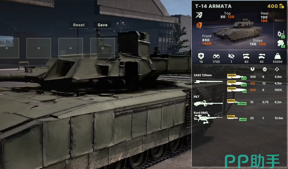 T-14配备125毫米主炮,可发射穿甲弹、高爆弹及炮射导弹,配备主动防御系统。其防护性能和炮射导弹导引头技术领先,视野和穿甲值优于T-80U。
