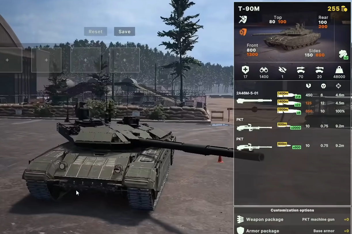 T-90M强化正面装甲和观测距离,配备12.7毫米机枪和竞技场主动防御系统。其武器升级包括软壳反应装甲和炮射导弹破甲能力提升,机动性和火力全面优化。