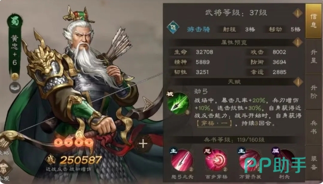 再看黄忠,他的劲弓天赋为他增添了不少战斗资本,这个天赋不仅提供了额外的暴击几率,还赋予了他近战反击的能力,也就是说即使敌人冒险贴近他,他也依然具备一定的还击空间,不至于陷入被动挨打的局面,怒弓之矢是黄忠的一项强大技能,它将破甲与输出完美,在战斗初期,黄忠可以利用这一技能对敌方前排进行先手削弱,打破敌人的防御阵线,而百步穿杨则充分体现了黄忠作为神射手的优势,在远距离输出时它能够提升伤害倍率,让黄忠在安全的距离外就能对敌人造成巨大的伤害,此外万箭齐发这一技能具有一圈范围打击能力,在战场上需要清场时,它是黄忠的有效手段,能够对周围的敌人造成大面积的伤害。