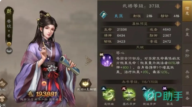 蔡琰,她的琴心天赋在每回合结束后都会自动治疗生命最低的友军,她的忘忧曲这一高倍率单体治疗技能确保前排的队友不会因为承受过多的伤害而倒下,塞外芳声则是一项群体治疗技能,并且还能附加治疗提升效果,当阵线整体承压时,蔡琰可以施展这一技能,让整个队伍的伤员都能得到及时的治疗,恢复战斗力,绝域芳声给群体带来的加成会让这个角色更具有拉扯以及撑线的价值。