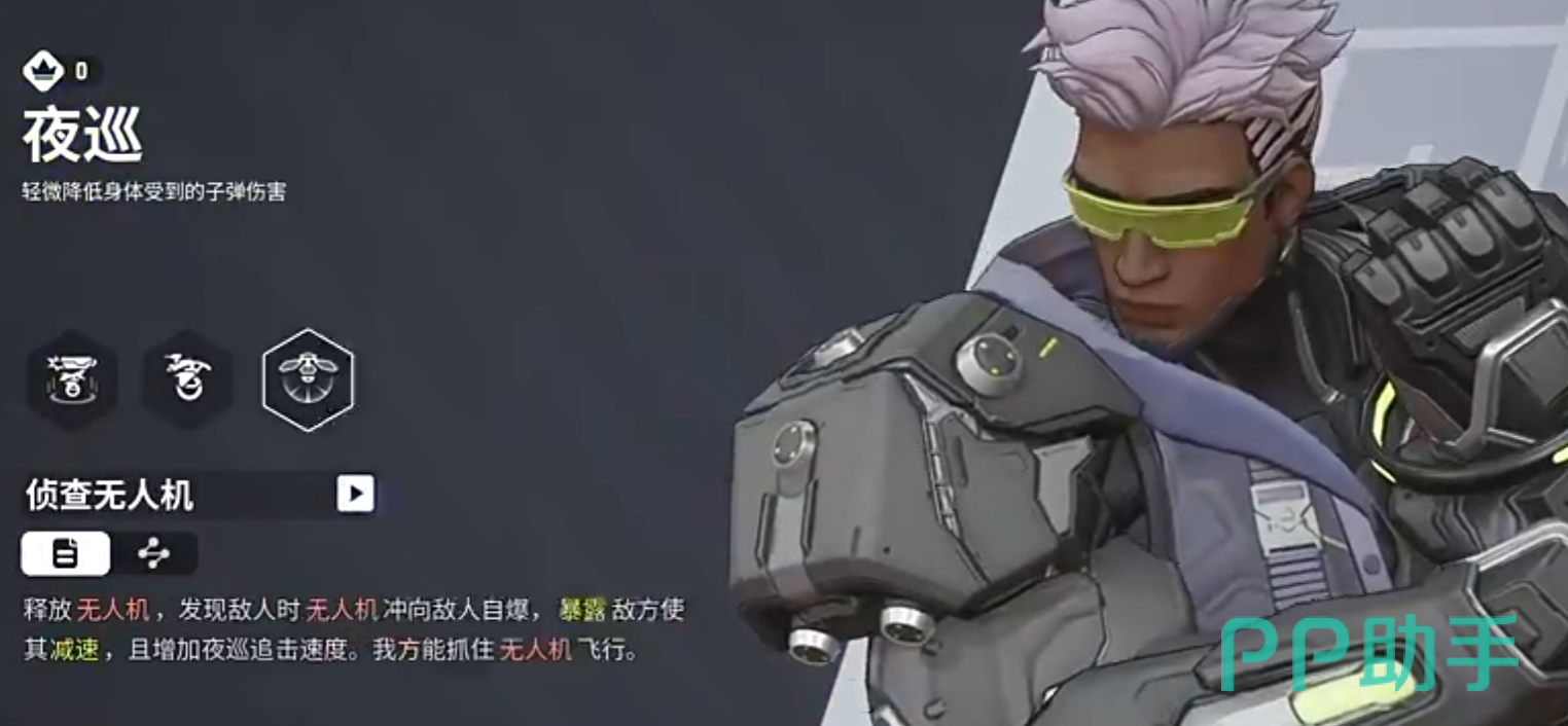 夜巡的第一个技能会放出巡查无人机朝着指定方向飞,若飞行期间发现敌人会直接向其冲去并自爆,所有遭受爆炸冲击的敌人除了会受伤外,还会暴露位置减移动速度,且夜巡自己若是追击暴露位置的敌人能得到加速,当无人机路过头顶时,我方所有成员都能拉着它飞行一段距离。