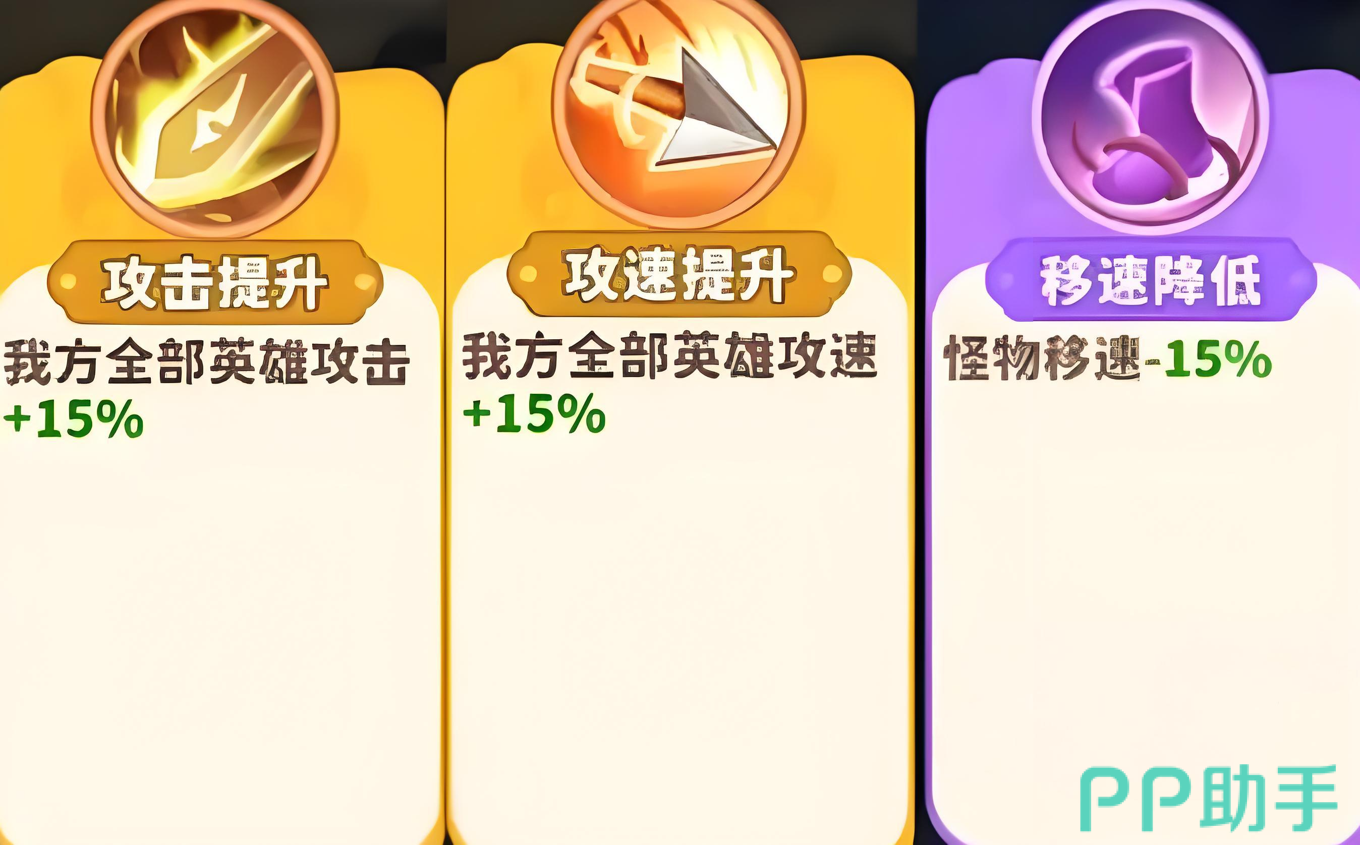 对局开始以后,每个魔宠都有蓝、紫以及金三种品质的技能可以选择,大家在技能选择上有三个技能是我们必须刷到的技能,分别是齐心协力、万能合成以及增量刷新,亲信协力可以对团队的整体输出进行强化,万能合成则可以合成人参娃娃,增量刷新则能让我们在刷新以后获得一个英雄,其他的技能可以选择攻击提升、攻速提升、移速降低等技能。