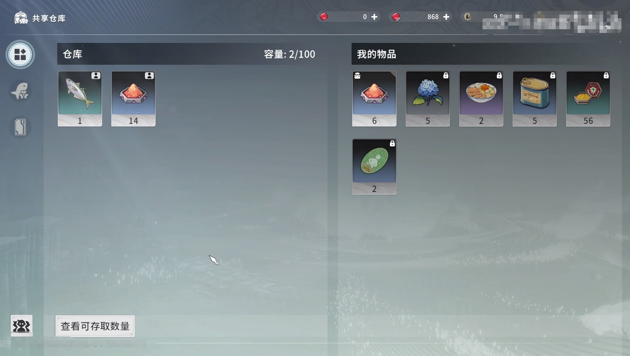共享仓库的容量是100,所以存放是有上限的共享仓库打开之后,可以看到我的物品和共享物品,玩家可以左下角查看可存取的物品,有普通物品和珍稀物品,点开之后系统也会给予提示,比如普通物品有采集的、药剂等,那么从共享仓库中取出的物品也是有限的,普通物品50为上限,珍稀物品15为上限。