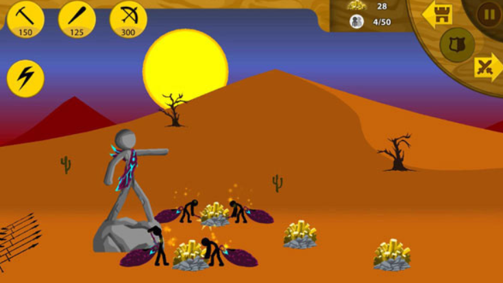 在火柴人战争游戏中,玩家将化身一方势力的领导者,首要任务是调配资源,指挥火柴人矿工前往矿区,高效采集黄金,这些黄金将成为后续发展的经济支柱,在兵种训练上有着丰富多元的选择,近战的剑士身形敏捷,擅长近身快速攻击,能够迅速撕开敌方防线,远程的弓箭手站位后排,凭借精准的箭术,在远距离对敌人造成杀伤,还有攻守兼备的矛士,既能用长矛进行强力穿刺攻击,又能举起盾牌抵御敌方远程伤害。