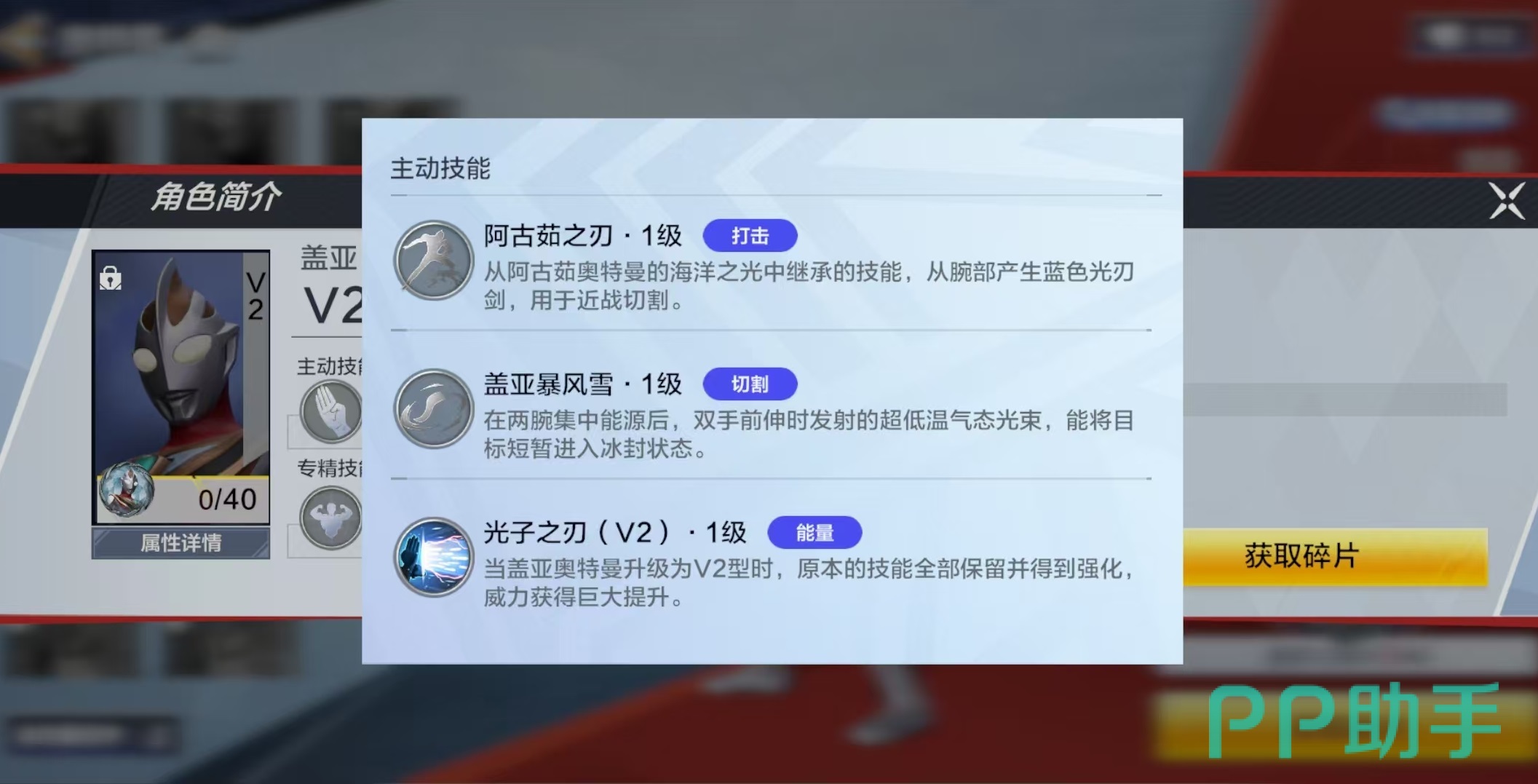 再来看一下v2型,v2型的主要技能包括阿古茹之刃、盖亚暴风雪和光之刃v2。阿古茹之刃是盖亚v2在阿古茹奥特曼的海洋之光中所继承过来的技能,在腕部产生蓝色光刃剑,可用于近战切割。盖亚暴风雪是在双腕集中能源后,双手发射超低温气态攻击,可将目标短暂进入冰封状态。光之刃v2是升级到v2型时,原本的技能进行强化后得到的,效果接近,但是威力获得了巨大提升。