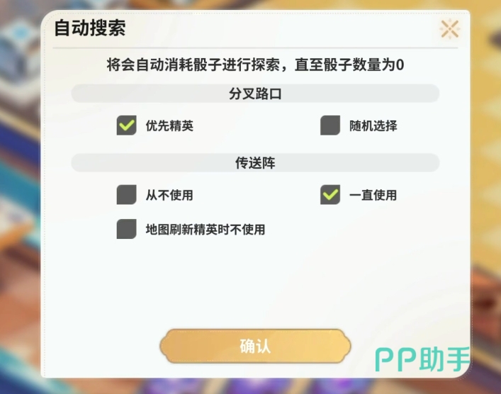 同时在玩法过程中玩家也能开启自动玩法,只要对玩法进行设置即可,设置的是投掷骰子的消耗。在咖啡厅的大富翁玩法中玩家能够投掷骰子的数量和玩家们在科技大楼的养成有关,骰子投掷次数会有限制,因此在游戏中设定自动消耗骰子数量直到为0,可以在分岔路径进行【优先精英】和【随机选择】的选择,在传送阵上也有进行选择。建议选择【精英游戏】和【一直使用】传送阵。