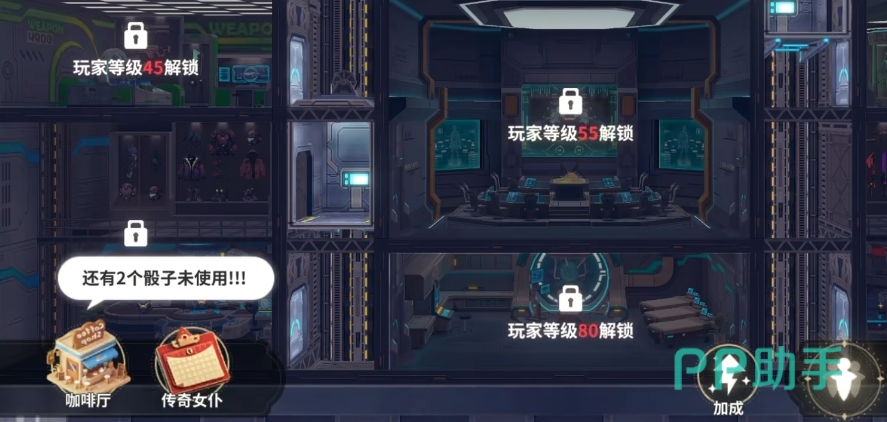 想要开启养成类板块的内容,需要玩家将等级提升到5级以上且通过抽卡的方式获得多个角色卡(角色卡越多越好),角色卡决定了能在科技大楼内投放的角色数量。科技大楼内有多个玩法内容,伴随玩家的等级来解锁,作为初始5级的玩家只能在大楼中解锁一个档口,获得一些属性加成。咖啡馆是开启科技大楼的玩家都能体验的玩法,咖啡厅玩法就是典型的大富翁玩法。