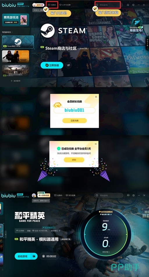 而且新用户现在输入兑换码biubiu001可获得72小时免费加速时长,加上注册赠送的24小时,总共能享受96小时的优质加速服务。这对于校园网用户或网络环境较差的地区玩家特别有帮助,能有效解决更新不了、射击延迟、技能判定不准等网络问题。