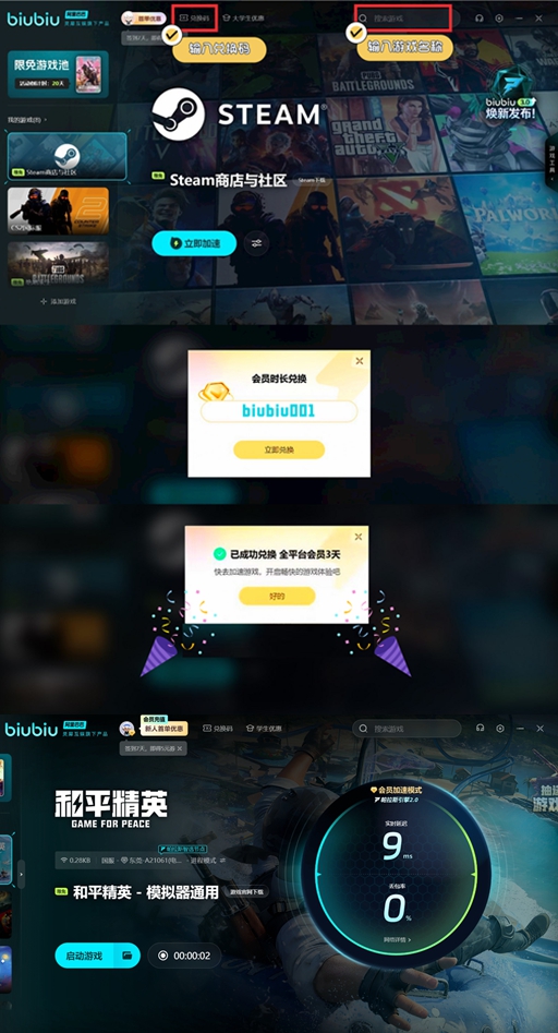 而且新人首次用自动送24小时的免费加速,输入兑换码biubiu001再领72小时,叠加后96小时免费时长,足够你适应pc端的一切操作。同时领取也很轻松,打开biubiu加速器搜“和平精英PC模拟器”,选“自动匹配最优节点”就能给模拟器和游戏双加速。