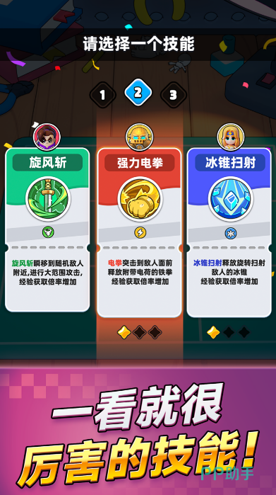 除此之外,游戏还加入了Roguelike式的技能升级机制,让每一场战斗都充满变数。每次击败敌人后,你将获得三选一的技能升级选项,这可以帮助你强化现有技能,或者召唤新的英雄加入战斗。而当你拥有高品质的英雄时,还可以激活羁绊技能,触发强大的爆发伤害或控场效果。